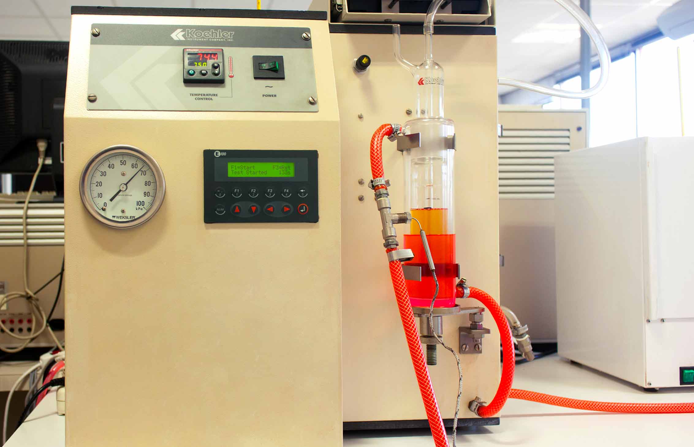 The equipment and the connected test evaluate the foaming characteristics and collapse time in lubricating oils. An airflow is injected in the fluid. It is possible to evaluate the foaming tendency of engine lubricants up to 150°C and it is typically required for hydraulic fluids since this phenomenon affects the fluid compressibility.