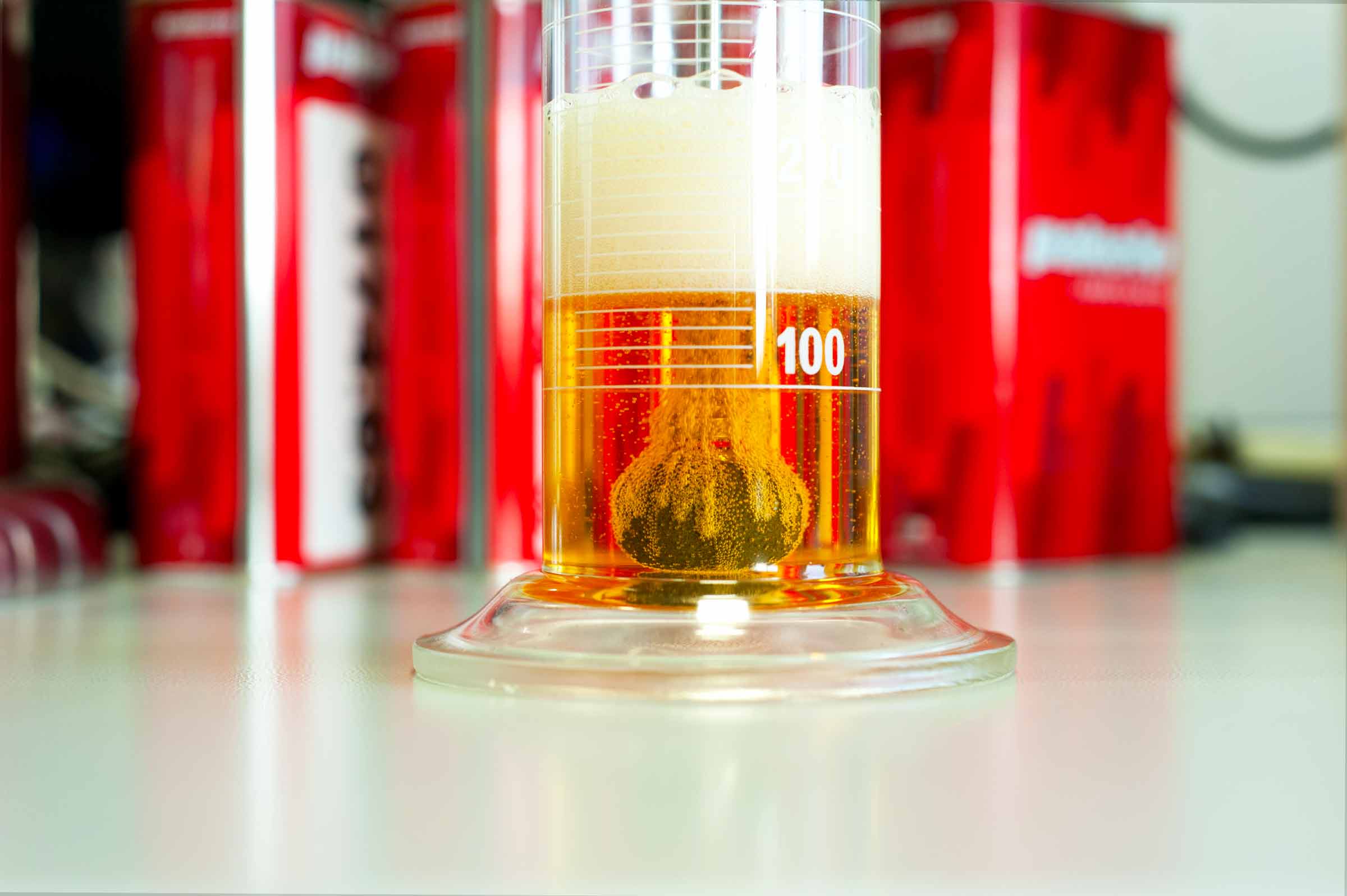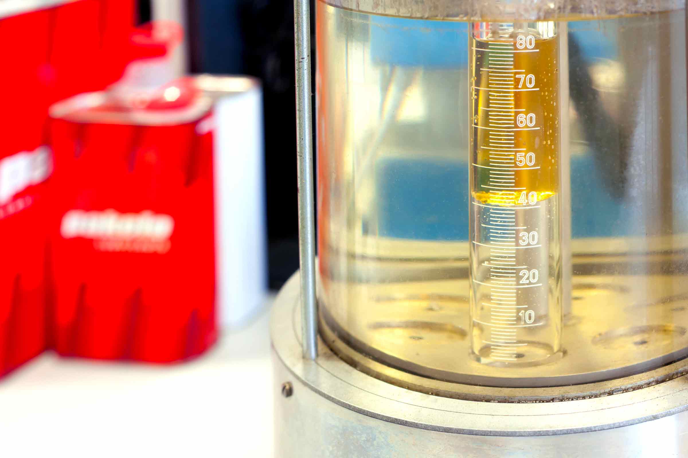 Due to mechanic shaking all lubricants entrain air: this is bad for the lubrication and for the incompressibility of the fluid. In modern hydraulic systems the decantation period is reduced and it is important to guarantee air release rapidly. The test is based on the density change measured with an electronic balance.